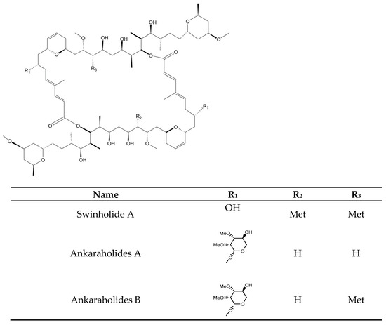 | Swinholide A | 1389.89 | Symploca cf. sp. (Phormidiaceae) | Marine | Fiji Islands | [248] |