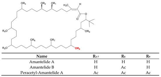 | Amantelide A | 789.14 | A Member of Oscillatoriales family | Marine | Puntan dos Amates (Guam) | [106] |