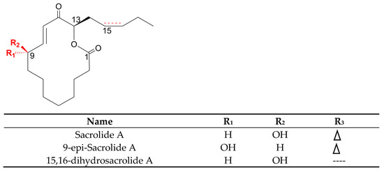| Sacrolide A | 308.41 | A. sacrum (Microcystaceae) | Freshwater | Kyushu District (Japan) | [107,108] |
