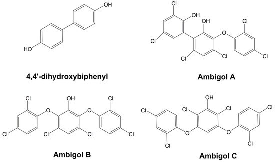 | 4,4′-dihydroxybiphenyl | 186.21 | Nostoc insulare SAG 54.79 (Nostocaceae) | Terrestrial | - | [97] |