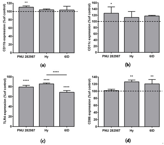 2.5. Effects of PNU 282987, Hypaphorine Methyl Ester, and D-6-Iodohypaphorine Methyl Ester (6ID) on the Expression of Macrophage Markers