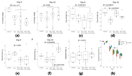 - Bove, S.E.; Calcaterra, S.L.; Brooker, R.M.; Huber, C.M.; Guzman, R.E.; Juneau, P.L.; Schrier, D.J.; Kilgore, K.S. Weight Bearing as a Measure of Disease Progression and Efficacy of Anti-Inflammatory Compounds in a Model of Monosodium Iodoacetate-Induced Osteoarthritis. Osteoarthr. Cartil. 2003, 11, 821–830. [Google Scholar] [CrossRef]
