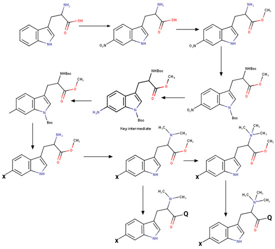 - Moriya, T.; Hagio, K.; Yoneda, N. A Facile Synthesis of 6-Chloro-D-Tryptophan. Bull. Chem. Soc. Jpn. 1975, 48, 2217–2218. [Google Scholar] [CrossRef]