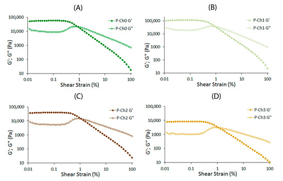 Strain sweep evaluation was performed from 0.01 to 100% strain amplitudes using a controlled shear rate mode at 20 °C at a constant frequency and stress of 1 Hz and 9.0 Pa, respectively. The storage modulus (G’LVE), loss modulus (G″LVE), loss tangent (tan δ) in LVE, complex modulus (G*LVE), limiting value of strain (the strain at which biopolymers enter from linear viscoelastic region to nonlinear viscoelastic region, γL), stress (τL), stress at flow point (τFP) with the corresponding complex modulus (G*FP), fracture stress (τFr), and slope of the loss tangent after flow point (tan δAF) were determined [49]. The shear strain dependence of G′ and G″ was determined using the power law equation: