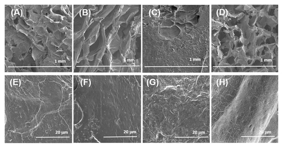 Scanning electron microscopy (SEM) showed that freeze-dried samples of pectin–chitosan gels have a loose, porous internal structure (Figure 2A–D). Although exact pore sizes have not been measured, micrographs with a magnification of 50× illustrate that the shape and size of the pores of the gel matrix changed with the increasing content of chitosan in the gel. The pore size of pectin gel P–Ch0 can be estimated to be approx. 150–200 µm, while the pores of the P–Ch1 and P–Ch2 gels were more elongated and much larger (ca. 400–600 µm). The P–Ch3 gel had rounded pores with a size close to that of the P–Ch0 gel (Figure 2A–D). Surface images taken at higher magnification (2000×) showed that the P–Ch2 gel had the highest surface roughness (Figure 2E–H).