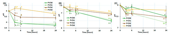 Galacturonic acid (GalA) was found to release from the gels incubated in Hank’s solution (Figure 4). The concentration of GalA in the incubation medium of P–Ch0 and P–Ch1 gels was significantly higher than that of P–Ch2 and P–Ch3 gels during incubation at pH 5.0. The release of GalA from the P–Ch0 gel did not depend on the pH of the incubation medium; the GalA concentration was about 500 µg/mL after 24 h of incubation. The release of GalA from the P–Ch1, P–Ch2, and P–Ch3 gels increased significantly with the increasing pH of the incubation medium.