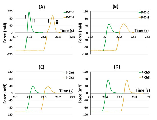 Figure 11 shows representative adhesion profiles of P–Ch0 and P–Ch3 gels to illustrate the observed pattern. The adhesion profiles included the deadhesion phase (Figure 11A(i)) with a peak force corresponding to the adhesion strength and a debonding curve (Figure 11A(ii)), during which the adhesion force decreased because of the gradual breaking of bonds between the gel surface and the serosa. As can be seen, the width of the P–Ch3 profile was larger than that of the P–Ch0, resulting in a higher work of adhesion, which was determined as the area under the force overtime curve.