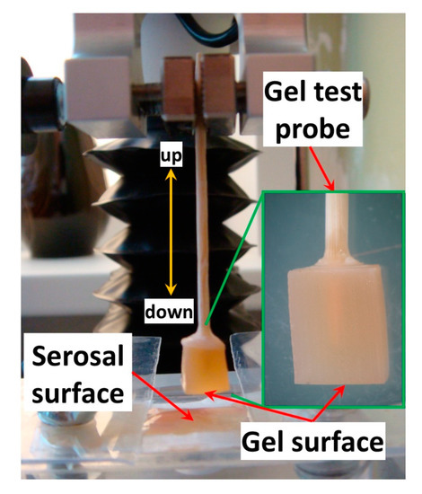 The change in mechanical properties upon incubation in Hanks’ solution also depended on the type of cross-links in the gels studied. The hardness and elasticity of P–Ch0 and P–Ch1 gels, in the formation of which calcium cross-linking is involved, decreased at pH 5.0, 7.4, and 8.0. This was probably due to calcium leaching and the destruction of egg-box structures due to the formation of calcium hydrogen phosphate. Unlike calcium-cross-linked gels, the mechanical strength of chitosan-containing gels formed predominantly by links between -COO and -NH3+ groups increased upon incubation in Hanks’ solutions of pH 7.4 and 8.0. The improvement in mechanical properties was consistent with the displacement of water and the compaction of the gel network due to the decharging of the -NH3+ groups of chitosan. It can also be assumed that the divalent anions of the Hanks solution (e.g., SO42−, H2PO4−) bind the positively charged amino groups of two adjacent chitosan chains, thereby forming additional cross-links. It is important that pectin–chitosan gels retain high values of elasticity and Young’s modulus. The dynamic movements of the intestinal wall, i.e., peristalsis, require the hydrogel adhesives to exhibit strong elasticity properties [5]. According to previous results [23], pre-incubation in Hank’s solution for 24 h significantly reduced the adhesion of the pectin gel to the serosa, while the adhesion of pectin–chitosan gels changed little. Therefore, our assumption was confirmed that chitosan-containing pectin gel could be more interesting as a serosal adhesive than chitosan-free pectin gel.