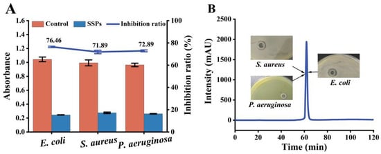 Antibacterial activity of SSPs before purification (A) and after purification (B). In Figure A, the histogram shows the absorbance of the bacterial suspensions, and the control group used the same volume of MHB medium instead of SSPs. In Figure B, the blue line shows the elution profiles of the SSPs during purification and the Oxford tower test was used to verify the antibacterial activity of the purified component.