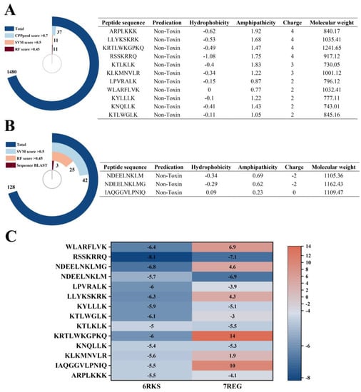 Virtual screening of AMPs. (A,B) represent the virtual screening results of AMPs based on de novo sequencing analysis and Uniprot database identification, respectively. The arc diagram shows the virtual screening process. According to the screening conditions, the simulation runs step by step from the outside of the arc to the inside, and the value indicates the number of peptides filtered in each step. The right side of the arc graph shows the physicochemical properties and toxicity prediction of the final screened candidate peptides. Sequence BLAST indicates the number of peptides after comparison with the CAMPR4 database. (C) shows the molecular docking score (binding energy (kcal/mol)) heat map of the screened candidate peptides with two receptor proteins (6RKS and 7REG).
