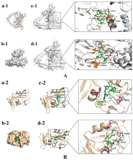 Molecular docking of peptides with DNA gyrase (A) and DHFR (B). The molecular surface of DNA gyrase is silvery-white, and that of DHFR is brown-yellow. a-1 and a-2 represent the Cartoon mode of DNA gyrase (in the binding state to both DNA strands) and DHFR. b-1 shows the binding modes of NDEELNKLM and RSSKRRQ on the molecular surface of DNA gyrase. b-2 shows the binding modes of NDEELNKLM and RSSKRRQ on the molecular surface of DHFR. DNA gyrase and DHFR are shown in surface mode, and the peptide molecules are shown in cartoon mode. c-1 and d-1 represent the 3D binding modes of NDEELNKLM and DNA gyrase, respectively. c-2 and d-2 represent the 3D binding modes of RSSKRRQ and DHFR, respectively. DNA gyrase and DHFR are shown in cartoon mode, and their residues are shown as brown-yellow and dark-red sticks. The amino acid names and sequence numbers indicating where the residues are located are shown in black, and the peptide molecules are shown as blue-green sticks. The yellow dashed lines represent hydrogen bonds, and the red dashed lines represent salt bridges. The marked numbers represent the bond lengths of the hydrogen bonds. The peptide molecules’ amino acid names and sequence numbers are shown in red.