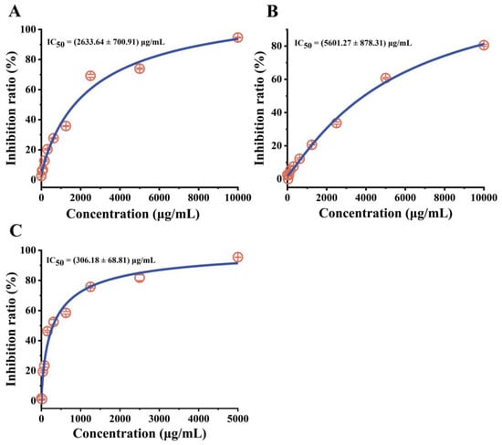 All experiments were repeated three times to ensure the reliability of the data. The experimental data were expressed as mean ± standard deviations. The data were processed and analyzed using the SPSS software (Version 24.0, Chicago, IL, USA), and statistical analysis was carried out by one-way analysis of variance (ANOVA). Duncan’s test was used to determine the significance of the differences among the means (differences were considered statistically significant at p < 0.05). The IC50 was calculated based on the logistic function using the Origin software (Version 2019b, Northampton, MA, USA).