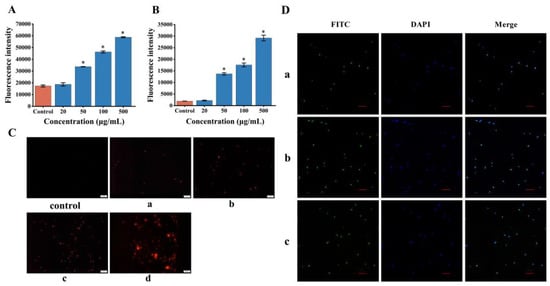Analysis of the antibacterial mechanism of NDEELNKLM and RSSKRRQ against E. coli. (A): analysis of membrane potential of E. coli; (B,C): analysis of cell viability of E. coli; (D): analysis of peptides localization. In (A,B), the concentration represents the final concentration of the mixed peptides, and * indicates a significant difference in fluorescence intensity compared to the control group (p < 0.05). In Figure (C), a–d represent the concentrations of the mixed peptides of 20, 50, 100 and 500 μg/mL, respectively. The control groups in Figures (A–C) do not contain peptides. Figure (D) shows the LSCM images of E. coli treated with different peptides (green: FITC, blue: DAPI), a: NDEELNKLM, b: RSSKRRQ and c: a mixture of NDEELNKLM and RSSKRRQ. The image scale is 10 μm.