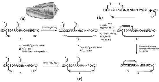 (a) Conus magus; (b) conotoxin EpI; and (c) protecting group-free synthesis of c[2,8]-dicarba-α-conotoxin EpI 6 (* signifies C-terminal amide).