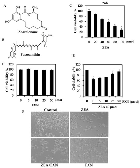 Analysis of ZEA and FXN viability. (A,B) Chemical structure of ZEA and FXN. (C) The viability of HepG2 cells was determined using the MTT assay after the addition of the indicated ZEA dosages for 24 h. (D) FXN cytotoxicity to HepG2 cells. (E) In the MTT assay, FXN protects against ZEA cytotoxicity (24 h). (F) HepG2 morphological changes. Values are presented as the mean and standard error of the mean (SD). One-way analysis of variance followed by Tukey’s post hoc test analysis was used for inter-group comparison. A significant difference is defined as a difference between the mean and standard deviation of three duplicates (n = 3), with * p < 0.05 control vs. ZEA and # p < 0.0.5ZEA vs. pre-treated.