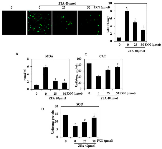 Effect of FXN on ZEA-induced ROS production in HepG2 cells. As shown in (A), HepG2 cells were then pre-treated with FXN (0, 25, and 50 µM) for 2 h, followed by ZEA (40 µM) for 4 h. H2DCFDA fluorescence was used to measure intracellular ROS levels. (B–D) MDA, SOD, and CAT. Values are presented as the mean and standard error of the mean (SD). One-way analysis of variance followed by Tukey’s post hoc test analysis was used for inter-group comparison. A significant difference is defined as a difference between the mean and standard deviation of three duplicates (n = 3), with * p < 0.05 control vs. ZEA and # p < 0.05 ZEA vs. pre-treated.