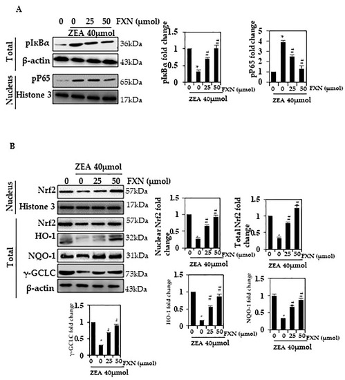 We investigated the role of FXN in NF-кB activation in this study. A decrease in phosphorylation of IкBα in the total extract of cells pre-treated with FXN (25 and 50 µM) was observed (Figure 4A). (p < 0.05). In this study, it was found that ZEA increased phosphorylation, while FXN inhibited it. There was more inhibition when cells were treated with 50 µM FXN than when they were treated with 25 µM FXN.