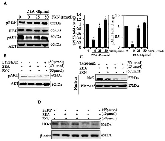 PI3K/AKT phosphorylation is activated by FXN. (A) The cells were treated with ZEA or FXN for 24 h. Western blotting results list the relative ratios of PI3K and AKT expression. (B,C) The cells were pre-treated with PI3K/AKT inhibitors for 2 h and then treated with FXN with or without ZEA for 24 h. Western blotting detected pAKT and Nrf2. (D) A Western blot was conducted after cells were exposed to SnPP for 1 h, followed by treatment with ZEA and FXN for 24 h. Values are presented as the mean and standard error of the mean (SD). One-way analysis of variance followed by Tukey’s post hoc test analysis was used for inter-group comparison. A significant difference is defined as a difference between the mean and standard deviation of three duplicates (n = 3), with * p < 0.05 control vs. ZEA and # p < 0.05 ZEA vs. pre-treated.
