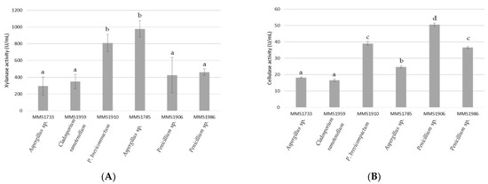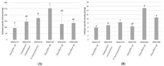 Comparing both cellulase and xylanase (enzymatic and specific activities), it appeared that all fungal strains clearly exhibited higher xylanase than cellulase activity (Figure 1 and Figure 2). The strain Penicillium sp. MMS1906 was characterized by a xylanolytic activity 8.4 times higher than the cellulolytic one, being the lowest gap between cellulolytic and xylanolytic activity compared with other isolates. The greatest difference between cellulolytic and xylanolytic activities was detected with Aspergillus sp. MMS1785, with a xylanolytic activity 39.6 times higher than cellulolytic one.
