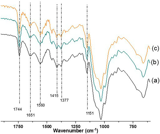 FTIR spectra of the developed CV-based scaffolds: (a) CV, (b) CV_Cub, and (c) CV_CubD.