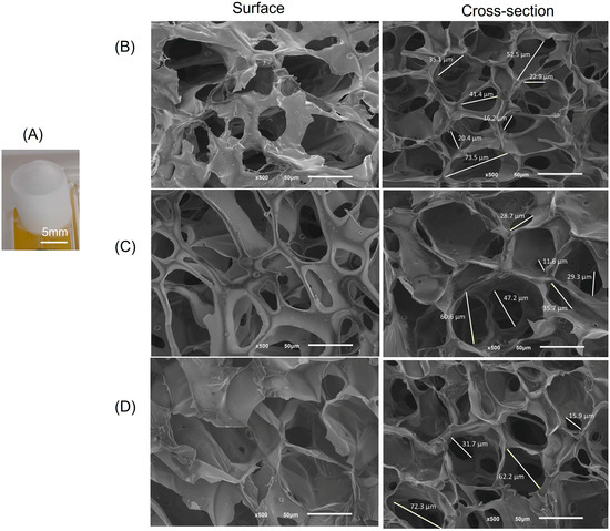 Appearance of the produced cylindrical scaffolds (A) and SEM microscopy images of the surface and cross-sections of the CV-based scaffolds; (B) CV; (C) CV_Cub; and (D) CV_CubD. Scale bar 50 µm and a magnification of 500×.