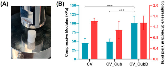 Mechanical properties of the scaffolds under compression load with 6 mm of diameter: (A) representative scaffold incorporating doped cubosomes before uniaxial compression test, and (B) compressive modulus and compressive strength at a yield at offset strain of 0.2%. The significance levels between groups was *** p < 0.001.