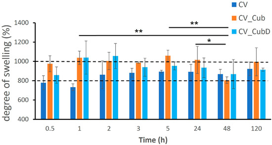 Degree of swelling of the CV-based scaffolds immersed in PBS. The significance levels between groups were * p < 0.05 and ** p < 0.01. The dashed lines meaning the two-maximum degree of swelling for the different formulations for comparison proposes.