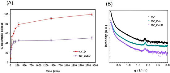 Before being incorporated into the CV system, the cubosomes (Cub) were characterized. The developed Cub presented a monomodal particle-size distribution with mean diameters ranging from 187 nm (CV_CubD) to 196 nm (CV), based on intensity measurements via SAXS analysis. These results suggested that adding 10 wt.% diclofenac promotes a slight decrease in the mean diameters observed for the cubosome dispersions, which was similar to the results of previous reports [20]. The efficiency of diclofenac encapsulation (EE %) in cubosome dispersions was 96.5 ± 0.1 wt.%, confirming its effective incorporation. This result was close to the results reported in other studies, where the incorporation of diclofenac in bilosomes, as a vesicular carrier, presented EE% with maximum values of 93.2 ± 2.21% [31].