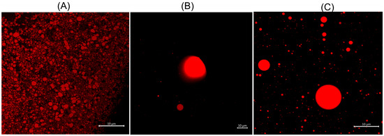Confocal images of the systems: cubosomes (A), CV emulsion (B), and CV_Cub-based emulsion (C). All systems were stained with nile red. Scale bar: 10µm.