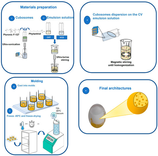 Schematic representation of the preparation of CV-based scaffolds doped with cubosomes.