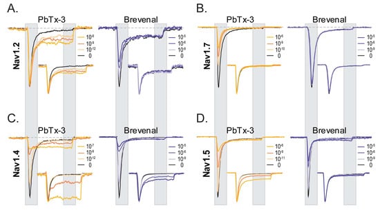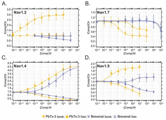 Within the Nav1 set analyzed here, Nav1.2 and Nav1.4 were most susceptible to PbTx-3 and brevenal modulation, whereas Nav1.5 and Nav1.7 appeared resistant. See Figure S1 for a side-by-side comparison.