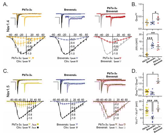 Figure 4 and Figure 5 display representative current traces mediated by human recombinant Nav channels in control and upon exposure to PbTx-3 and brevenal. I-V plots from the normalized peak and late (when present) currents amplitudes (Ipeak/Ipeakmax and Ilate/Ipeakmax) were fitted to a Boltzmann function rendering the half-maximal activation potential (V0.5) and normalized macroscopic conductance (Gmax) parameters (see Section 4). The changes in V0.5 (ΔV0.5 = V0.5Comp − V0.5Ctr) and relative Gmax (GmaxRel = GmaxComp/GmaxCtr) observed in the presence of PbTx-3 and brevenal and control conditions were then calculated and compared for all assayed conditions.