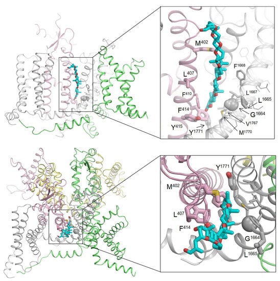 We used the cryo-EM structure of the Nav1.2 channel [27] (PDB ID: 6J8E) to dock PbTx-2 in the lipid-exposed cleft between repeat domains I and IV. The ZMM program (www.zmmsoft.ca (accessed on 15 January 2023)).was employed to dock the toxin. The energy was calculated using the AMBER force field [41,42] with distance- and environment-dependent dielectric function [43]. The toxin–channel complex was optimized with Monte Carlo energy minimizations [44]. Atomic charges in PbTx-2 were calculated with the MOPAC program [45].