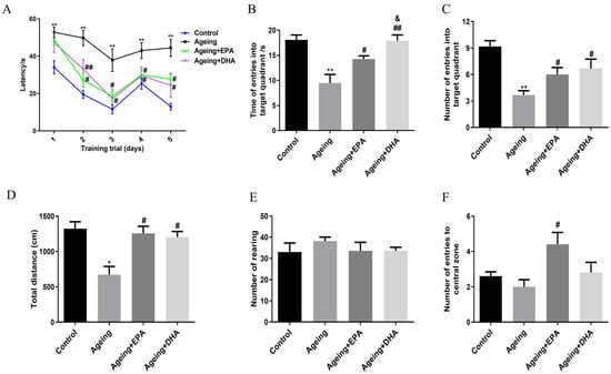 Figure 1. Memory and locomotor impairment that occurred in ageing rats was better improved by DHA than by EPA. The latency time (A), time (B) and number (C) of entries into the target quadrant in MWM behavioral test. The total distance (D), number of rearing (E) and entries into the central zone (F) in the OFT. The data were expressed as mean ± SEM (n = 12 in control group, n = 9 in other three groups). * p < 0.05, ** p < 0.01 versus control group; # p < 0.05, ## p < 0.01 versus ageing group. & p < 0.05 versus ageing + EPA group.
