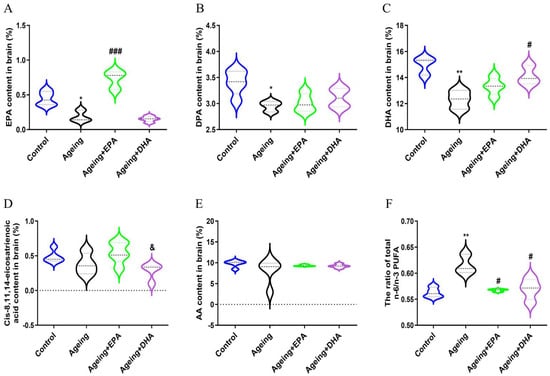 Figure 2. The increase in n-6/n-3 PUFAs ratio in ageing rats was effectively reversed by EPA and DHA. The contents of n-3 PUFAs EPA (A), DPA (B), and DHA (C) and contents of n-6 PUFAs cis-8,11,14-eicosatrienoic acid (D) and AA (E) as well as n-6/n-3 PUFAs ratio (F). The data were expressed as mean ± SEM (n = 5). * p < 0.05, ** p < 0.01 versus control group; # p < 0.05, ### p < 0.001 versus ageing group. & p < 0.05 versus ageing + EPA group.