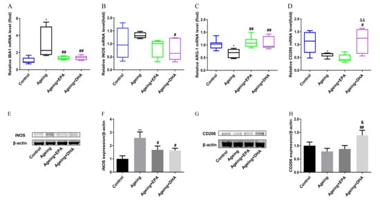 Figure 3. Imbalance between microglial M1 and M2 polarization that occurred in ageing rats was attenuated by EPA and DHA. The mRNA expression of IBA1 (A), iNOS (B), ARG-1 (C), and CD206 (D). The protein expression of iNOS (E,F) and CD206 (G,H). The data were expressed as mean ± SEM (n = 6). * p < 0.05, ** p < 0.01 versus control group; # p < 0.05, ## p < 0.01 versus ageing group. & p < 0.05, && p < 0.01 versus ageing+ EPA group.