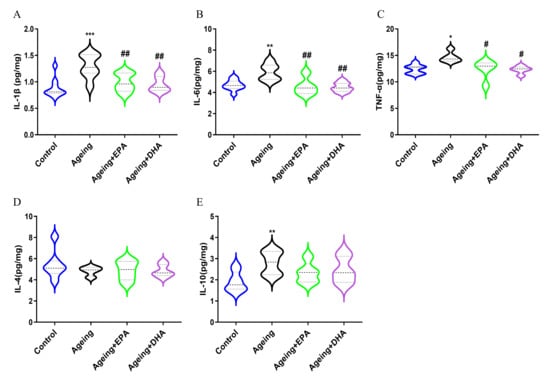 Figure 4. Neuroinflammatory responses upregulated during normal ageing were inhibited by EPA and DHA. The concentrations of pro-inflammatory cytokines IL-1β (A), IL-6 (B), and TNF-α (C). The concentrations of anti-inflammatory cytokines IL-4 (D) and IL-10 (E). * p < 0.05, ** p < 0.01, *** p < 0.001 versus control group; # p < 0.05, ## p < 0.01 versus ageing group.
