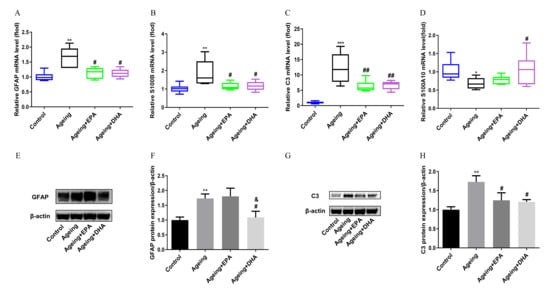 Figure 5. Astroglia polarization imbalance induced in the ageing rat hippocampus was reversed by EPA and DHA. The mRNA expressions of GFAP (A), S100B (B), C3 (C), and S100A10 (D). The WB bands of marker proteins (E,G), and the relative protein expression of GFAP (F) and C3 (H). The data were expressed as mean ± SEM (n = 6). * p < 0.05, ** p < 0.01, *** p < 0.001 versus control group; # p < 0.05, ## p < 0.01 versus ageing group; & p < 0.05 versus ageing + EPA group.