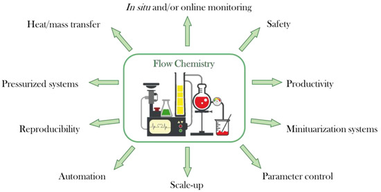 The benefits of flow versus batch processes are well-established [10,11]. Very likely, safety is one of the main concerns for the pharmaceutical industry. If hazardous reagents, or unstable or toxic intermediates participate in the reaction, they are not accumulated but are rapidly consumed in the small reactor size [12]. Similarly, the lower space of vapor pressure in the reactor decreases the risk of explosion, for instance, in hydrogenation or carboxylation reactions. The reaction rate in continuous flow can also be increased when high temperatures or pressures are installed. In addition, the better heat and mass transfer processes in flow allows us to scale up exothermic reactions, avoiding the risks of heat removal. There is also an exquisite control of the reaction parameters (e.g., residence times, concentrations, and temperatures) which is usually related to the obtention of more selective transformations [13]. Consequently, an increase in the reaction yield and purity are observed with a small footprint.