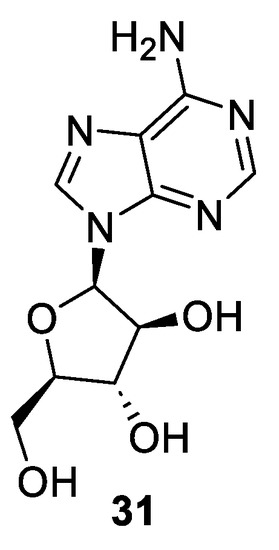 1-β-D-arabinofuranosyladenine (31), most commonly known as vidarabine or ara-A (Figure 4), is a synthetic analog of spongosine, a nucleoside isolated from the Caribbean sponge Cryptotethya crypta in 1951 by Bergmann and Feeney [39]. Vidarabine is active against herpes viruses, poxviruses, and certain hepadnarviruses, rhabdoviruses, and RNA tumor viruses, and it also shows activity against the vaccinia virus in both in vitro and in vivo studies. It has been used for herpes encephalitis and other herpes infection treatments. However, nowadays, it is no longer used due to newer and more efficient antiviral drugs currently available in the market. Vidarabine was one of the three marine-derived drugs approved by the U.S Food and Drug Administration (FDA) and the first antiviral nucleoside to be licensed for the treatment of systematic herpes virus infection [40].