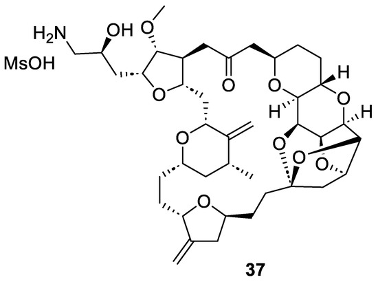 Eribulin mesylate or Halaven® (37, Figure 5) is a synthetic macrocyclic ketone derivative of the marine natural product halichondrin B, which was isolated from the marine sponge Halichondria okadai in 1986 [46]. Eribulin inhibits the growth phase of microtubules without affecting the shortening phase and sequesters tubulin into non-productive aggregates [47]. For this reason, in 2010, after Phase III trials, FDA approved eribulin for the treatment of metastatic breast cancer [48,49]. A few years later, eribulin mesylate (37) was also approved for patients with metastatic or unresectable liposarcoma who have received a prior ineffective treatment [50]. Nowadays, eribulin has been approved in over 50 countries.
