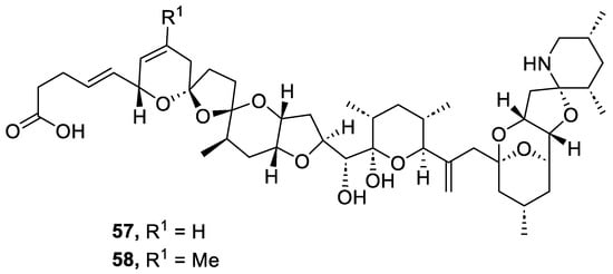 During the following years, the total synthesis in batch mode of various azaspiracids such as (+)-azaspiracid-1 ((+)-57) [84,85], (−)-azaspiracid-1 ((−)-57) [86,87], and azaspiracid-2 (58) [83] was developed.