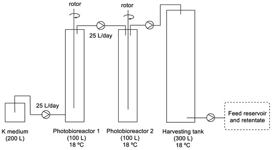 The equipment was formed by two stirred photobioreactors in a series of 100 L each, followed by a harvesting tank of 300 L. Neon tubes provided light to one side of the photobiorector with a photon flux density at 200 μmol m−2 s−1 and a photoperiod of 16 h of light and 8 h of dark. After that, the feed reservoir and retentate were obtained, whose extraction gives AZA1 and −2 (Figure 8).