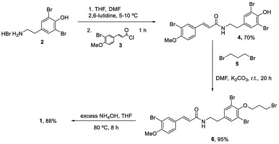 The first total synthesis was reported in 2009 by Ullah and Arafeh using a traditional batch approach [33]. The addition of the acid chloride (3) to a solution of dibrominated agent (2) occurred at 5–10 °C in a 1:1 mixture of THF/DMF and using 2,6-lutidine as base. This reaction generated amide (4) in a 70% yield after column purification. Alkylation of (4) with an excess of 1,3-dibromopropane (5) in DMF using potassium carbonate as the base generated (6) an excellent yield (95%). Then, treatment of (6) with an excess of ammonium hydroxide at 80 °C produced the final aplysamine 6 (1) with an overall yield of 27% (Scheme 1).