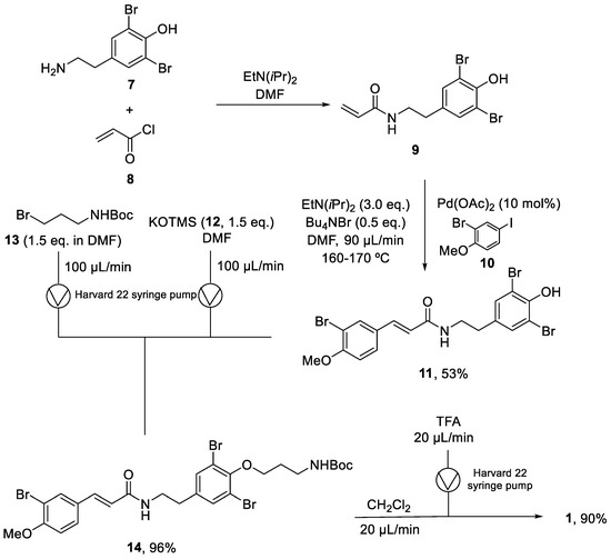 Years later, in 2010, Organ and coworkers reported the synthesis of the same molecule using a continuous flow methodology [34]. The key step was a microwave-assisted continuous-flow organic synthesis (MACOS) Heck reaction. The synthesis started with the acylation of (7) using EtN(iPr)2 in DMF to provide the intermediate (9). The crude of this reaction was directly used in the next step. The coupling of dibrominated agent (9) with aryl iodide (10) in a microwave-assisted Heck reaction produced (11) with a 53% yield. The next step was the alkylation of phenol (10) to provide (13) in a 96% yield. For phenol deprotonation, potassium trimethylsilanoxide (12) was loaded into a syringe with (11), while the alkyl bromide (13) was loaded into a second syringe to be pumped into a reaction loop. The final step was the deprotection of the compound (14) with TFA. As it could not be carried out in DMF, another step was necessary to change the solvent to CH2Cl2 and provide (1) with a 90% yield (Scheme 2). With this synthetic route, aplysamine 6 was obtained with a 46% overall yield in four steps and in a final quantity of 0.63 g. Comparing the batch methodology with the continuous flow approach, the latter provides the product in fewer reaction steps, with higher yields, and it could easily been scaled up.