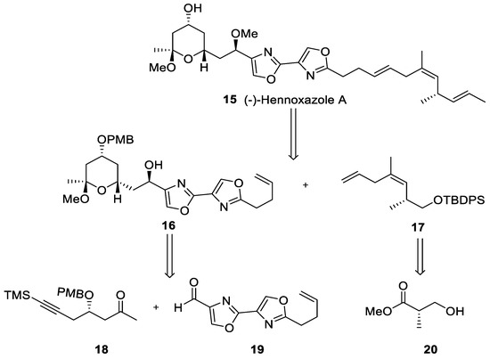 Retrosynthetic study of (−)-hennoxazole A (15).