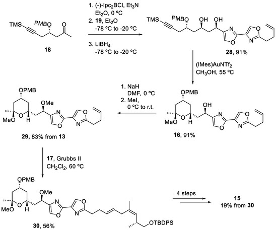 Once the three fragments were prepared in the gram scale in both batch and flow methods, they were assembled to form the (−)-hennoxazole A (Scheme 5). Ketone (18) reacted with aldehyde (19) using (−)-Ipc2BCl, followed by an in situ reduction to obtain diol (28) as a single diastereomer. The next step consisted of a gold-catalyzed cyclization to form the tetrahydropyran ring intermediate (16), which was then methylated to prepare (29). The addition of fragment (17) to intermediate (29) required a second-generation Grubbs complex to promote the formation of (30). For more steps, involving deprotection and olefination steps generated (−)-hennoxazole A (15) with a 19% overall yield.