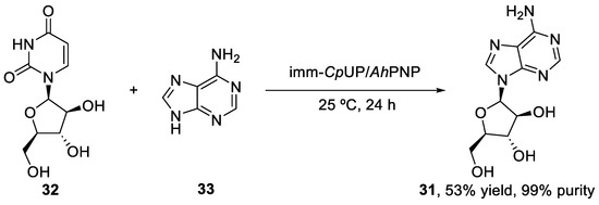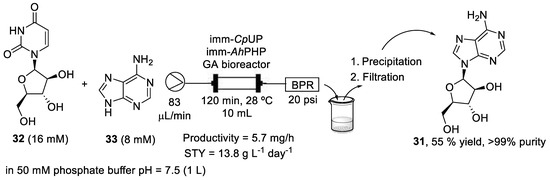 In this context, a flow-biocatalyzed synthesis of vidarabine using nucleoside phosphorylases was reported by Tamborini et al. [42]. Authors used an enzymatic twosome that had previously been used successfully for the synthesis of vidarabine in batch mode: a uridine phosphorylase from Clostridium perfrigens (CpUP) and a purine nucleoside phosphorylase from Aeromonas hydrophila (AhPNP). These two enzymes were co-immobilized on two hydrophilic supports, glyoxyl-agarose (GA) and EziGTM1 (Opal), by flowing a solution of the phosphorylases through them. The stability of both bioreactors was studied and the GA bioreactor was thereafter chosen because the conversion achieved with the EziGTM bioreactor decreased to less than 10% due to the enzyme lost in the exiting flow stream. Thus, a bioreactor of 10 mL volume, 15 mm diameter, 150 mm length, and with 10 g of GA was prepared. A solution containing arabinofuranosyl uracil (32, araU, 16 mM) as the sugar donor and adenine (33, 8 mM) as the sugar acceptor in 50 mM phosphate buffer pH = 7.5 (1 L) was pumped through the bioreactor at 83 μL/min and pressurized at 20 psi, with a residence time of 120 min and a temperature of 28 °C, achieving a 67% conversion. The exiting flow stream was collected into a cooled vessel (4 °C), where vidarabine precipitated due to its poor water solubility. Finally, vidarabine was recovered by filtration under vacuum, washed with cold water, and dried. After 8 days of continuous work of the bioreactor, vidarabine (araA, 31) was obtained with a 55% yield and >99% purity (Scheme 6).