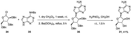 Finally, if the established chemical synthesis of vidarabine is taken into account, the advantages of the biocatalyzed flow-based approach are even clearer. This synthesis begins with the reaction between N-benzoyladenine (35) and 2,3,5-O-benzyl-D-arabinofuranosyl chloride (34) to give the product (36). The hydrogenation of this intermediate affords vidarabine (31), with an overall yield of 41% (Scheme 8) [45].