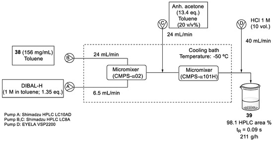 The reduction of ester (38) to aldehyde (39) was optimized to reduce the formation of the over-reduced alcohol. Two different solutions, ester (38) in toluene and DIBAL-H (1 M in toluene), were fed into the first micromixer. A line delivering acetone in toluene was incorporated before the quenching with HCl 1 M. After running the flow system continuously for 87 min, (39) was almost quantitatively obtained (98.1%, HPLC area). The temperature was controlled by submerging the reactor and tubing in a cooling bath at −50 °C (Scheme 10). Despite the requirement of cryogenic conditions in this methodology, the surface area of heat transfer was small and better energy efficiency was obtained [56].